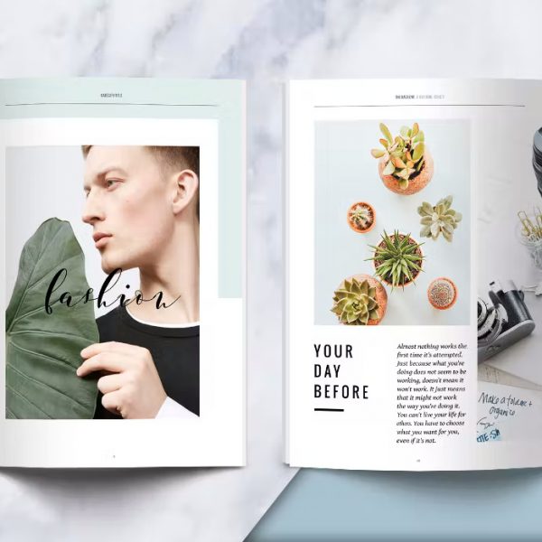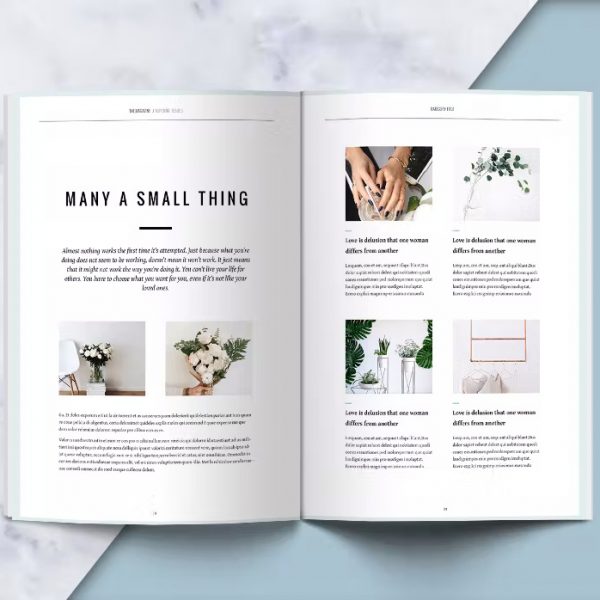 Mẫu catalogue: Mang phong cách hiện đại và vô cùng đơn giản khi sử dụng màu trắng xanh làm cho ấn phẩm. Không chỉ giúp người xem cảm thấy dễ chịu, thoải mái, mà nó còn làm tôn lên nội dung và hình ảnh sản phẩm để có thể hiện thông điệp của doanh nghiệp, tổ chức. Phần thông tin được sắp xếp gọn gàng, theo một bố cục nhất định với gam màu trắng nổi bật trên nền đen, và tiêu đề được nhấn nhá một chút bởi gam xanh nổi bật. Mẫu catalogue này được hứa hẹn là sẽ phù hợp với đa dạng các lĩnh vực như kinh doanh, thời trang, sắc đẹp, sự kiện,…